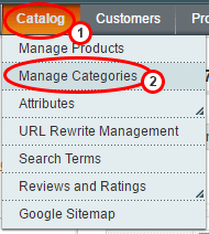 1. Log into Magento admin and navigate to Catalog (1) > Manage Categories (2)