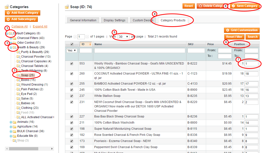 6. Enter the number in each "position" box next to the product (7) in the order you want them to display in the category.